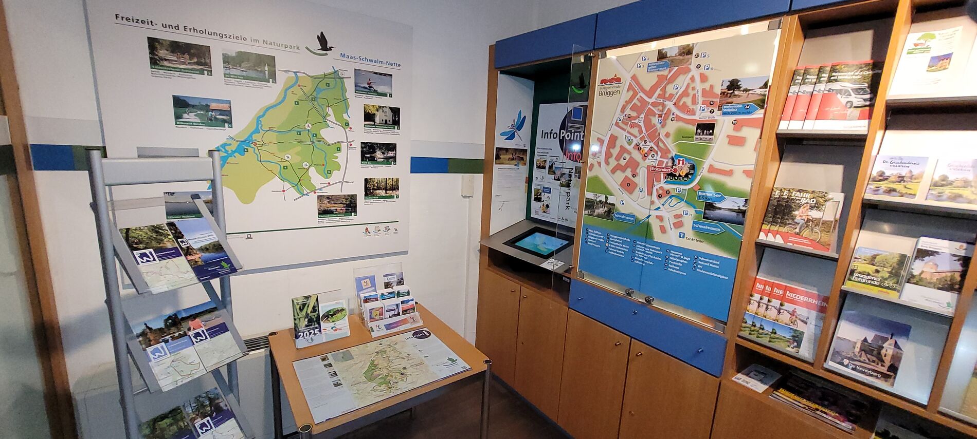 Im Foyer befindet sich ein Info Point mit vielfältigem Informationsmaterial über den Naturpark-Schwalm-Nette. Neben verschiedensten Publikationen wie z.B. Flyern zu Premium-Wanderwegen, Kartenmaterial oder den aktuellen Veranstaltungskalender bekommen Sie an der Besuchertheke der Infostelle auch gerne eine persönliche Beratung zu Themen rund um den Naturpark oder Wanderrouten.